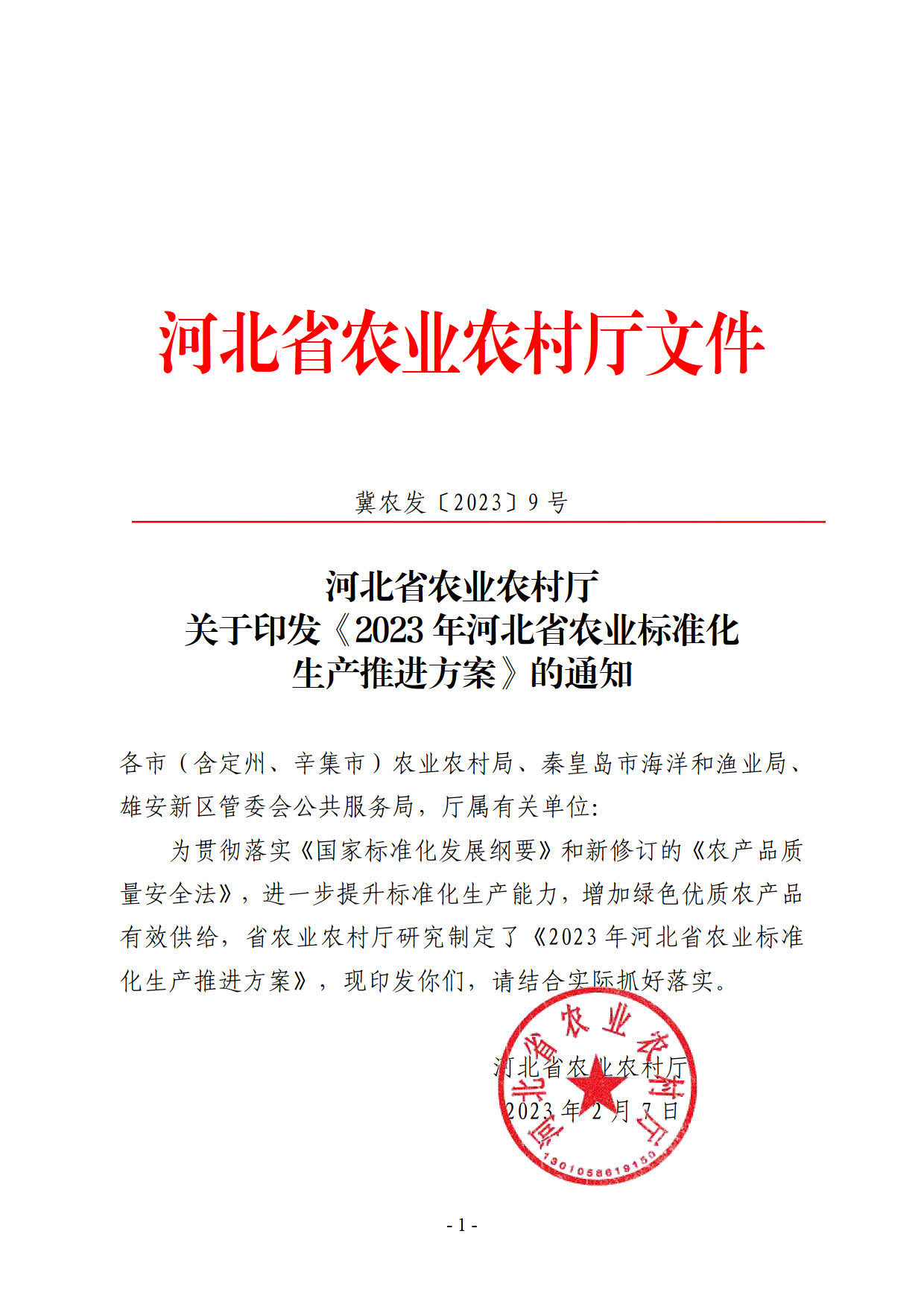 河北省农业农村厅关于印发《2023年河北省农业标准化生产推进方案》的通知