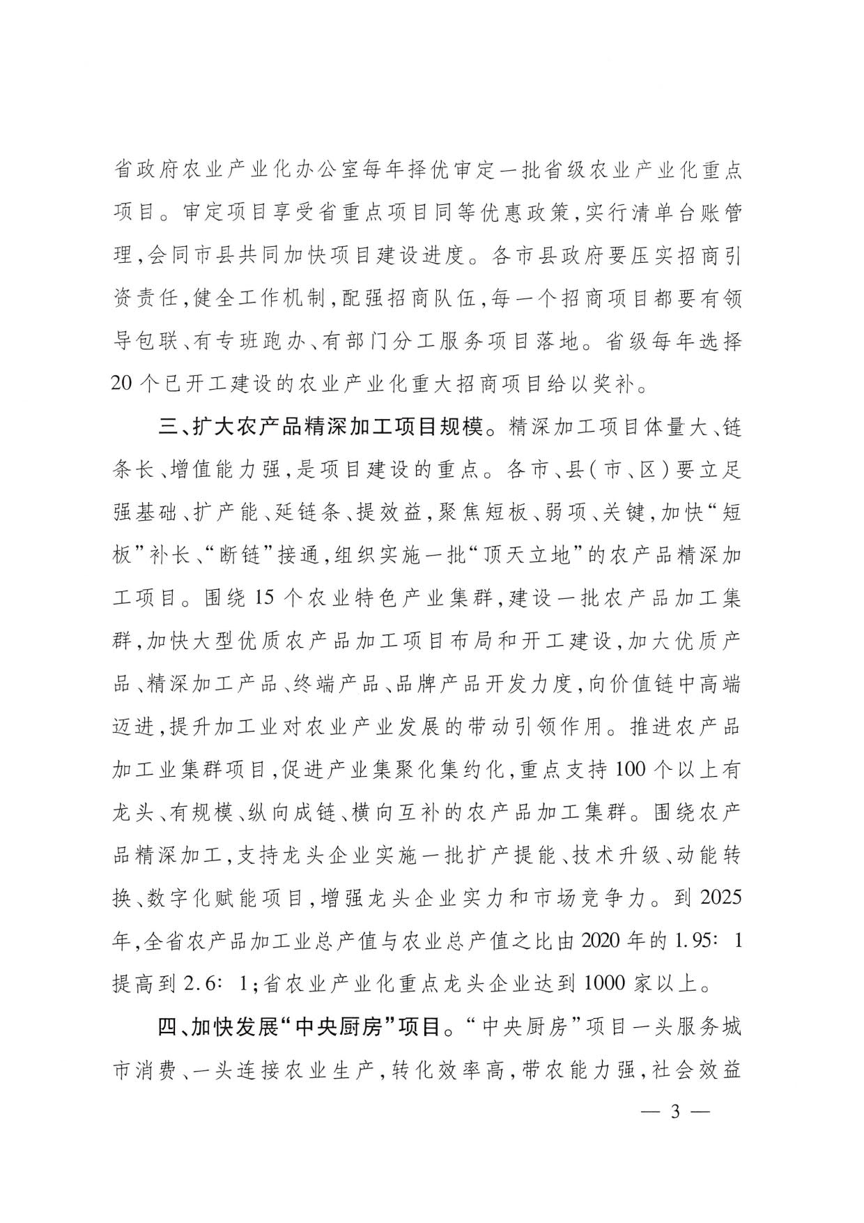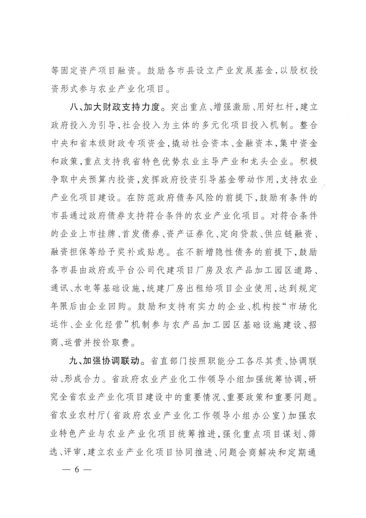 为深入贯彻中央农村工作会议、省委农村工作会议精神,落实省委、省政府关于抓投资上项目促发展的部署,坚持以项目建设为统领,组织和推动各市、县(区、市)完善政策措施,加强招商引资,优化营商环境,扩大投资规模,推动农业产业化项目建设实现新突破,发挥在壮大龙头企业、完善产业链条、带动农民增收、促进乡村产业振兴中的重要作用,形成项目带动、三产融合、加快发展的新格局,制定如下意见: