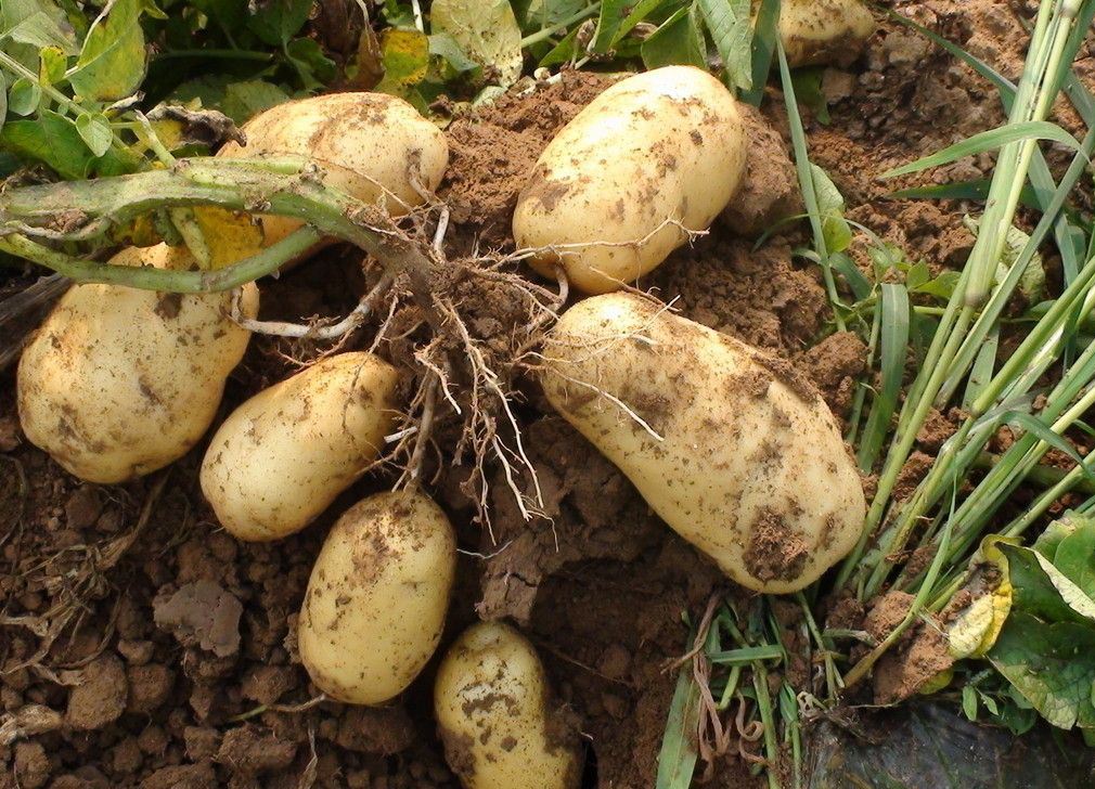 7.适时收获。早熟品种出苗后到收获一般需要60~70天,待茎叶黄熟时,就可以开始收获。本办法栽培马铃薯,70%的薯块在稻草以下土层以上,收获时,只要拨开稻草即可拣薯。薯块可以一次性收完,也可以分批次收获,即将稻草拨开,先拣掉大薯块,再盖上草,让小薯块继续生长,这样既能选择最佳薯型,及时上市,又能获得高产量,提高经济效益。