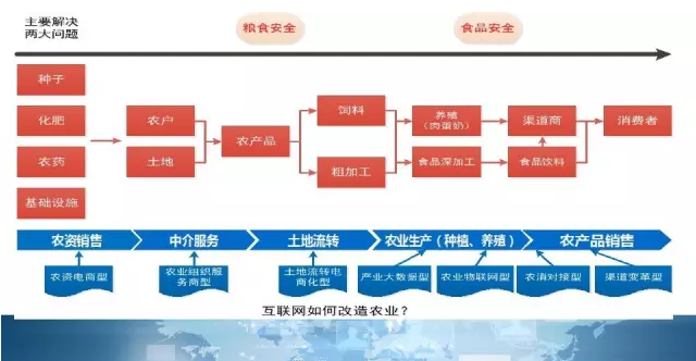 互联网+农业是“以新的视角看农业、新的技术做农业、新的模式运营农业”。 互联网将对整个农业产业链进行改造,从农资销售、中介服务、土地流转到农业生产、农产品销售,整个完整的农业产业链上都已经出现了(移动)互联网、大数据的身影。