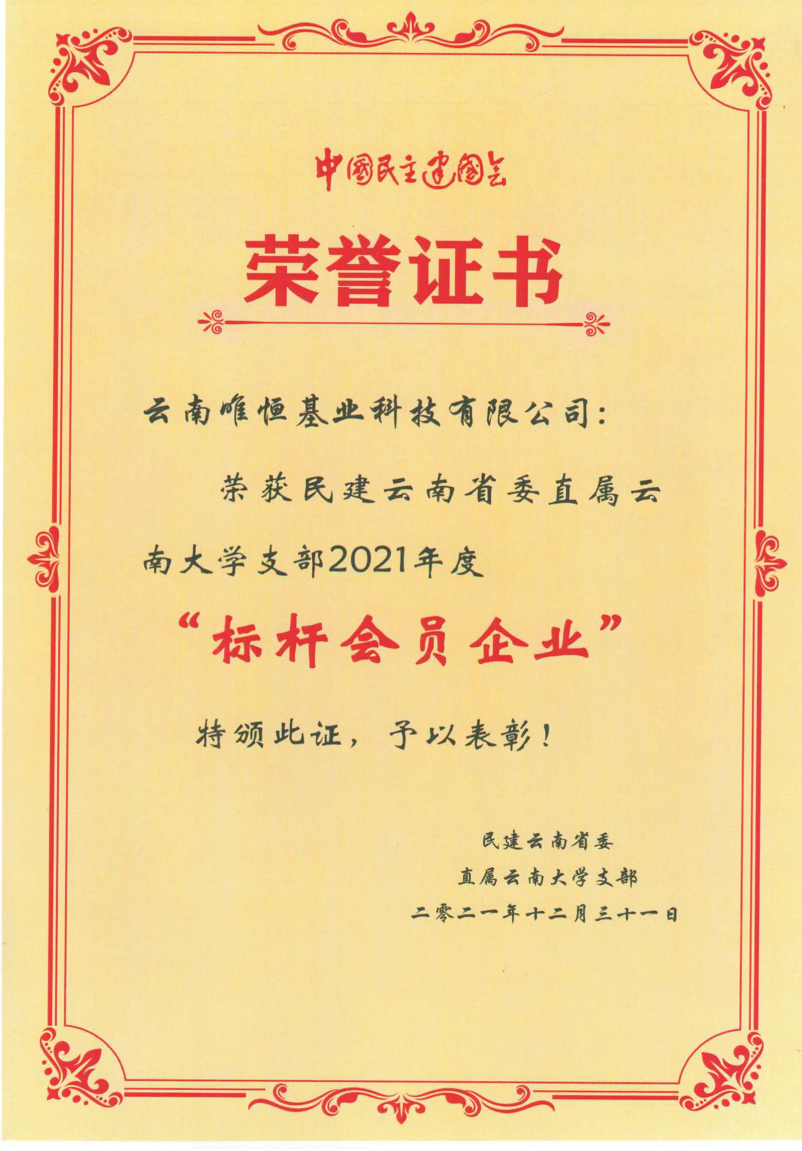 近日,云南唯恒基业科技有限公司(以下简称唯恒)获得民建云南省委直属云南大学支部2021年度“标杆会员企业”荣誉证书。