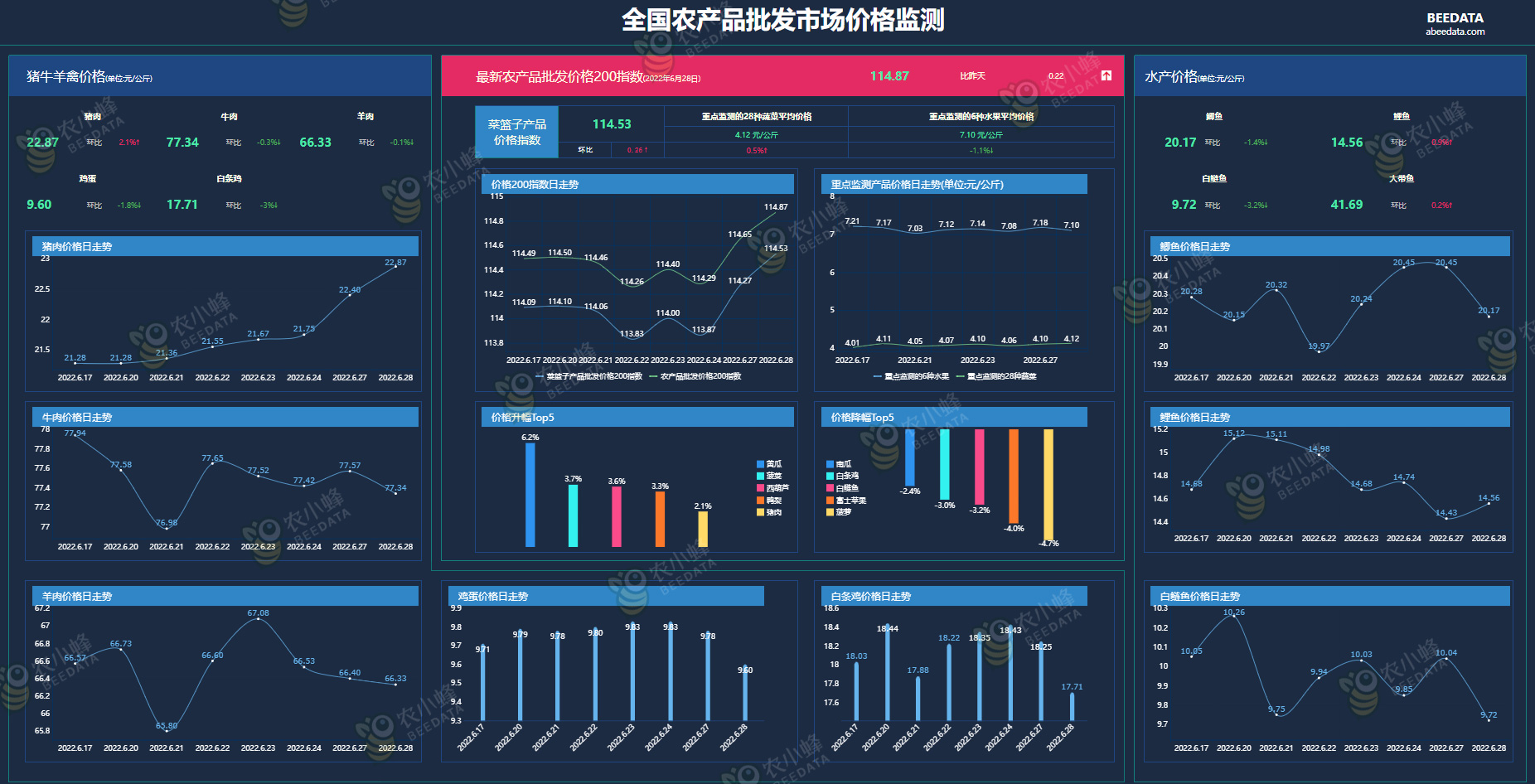 据农业农村部监测,今日(6月28日,下同)"农产品批发价格200指数"为114.87,比昨天(6月27日,下同)上升0.22个点,“菜篮子”产品批发价格指数为114.53,比昨天上升0.26个点。