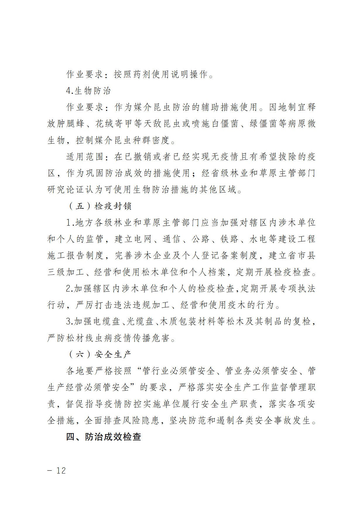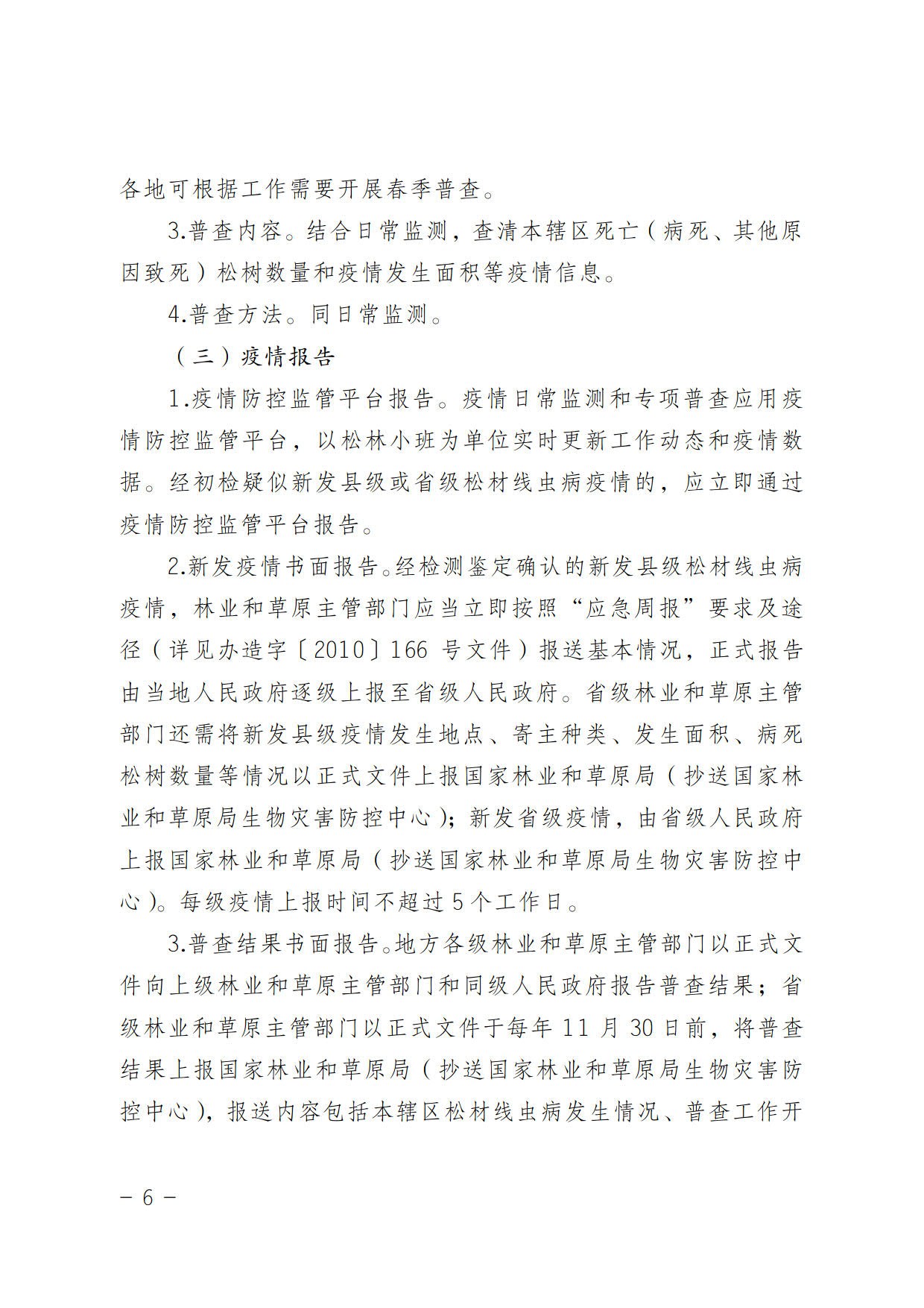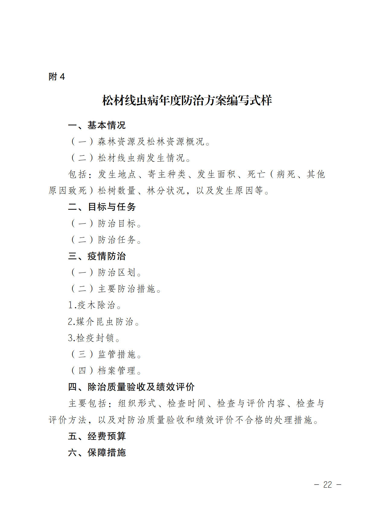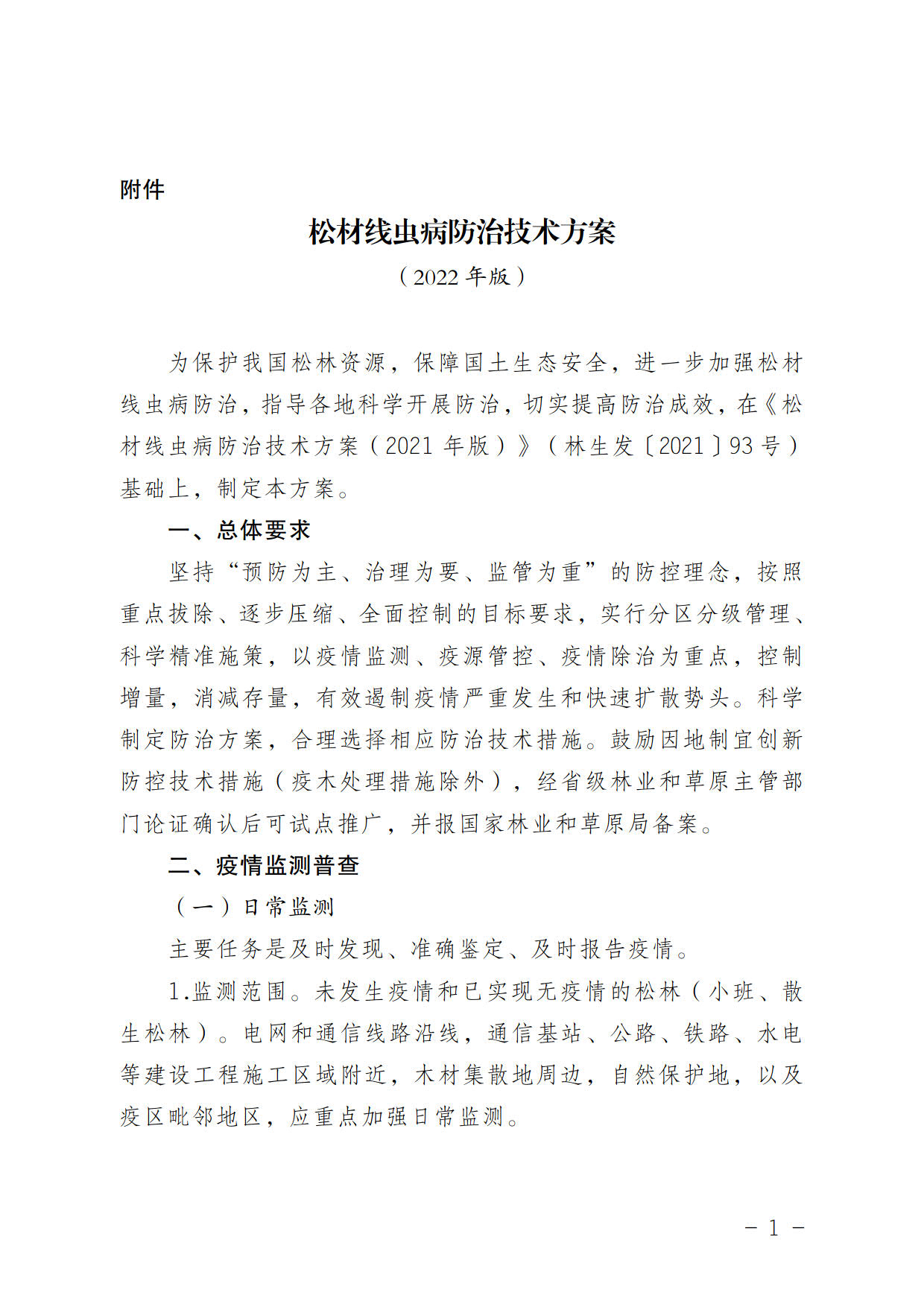 为坚决遏制松材线虫病疫情严重发生和扩散蔓延势头,指导各地科学精准系统做好松材线虫病疫情防控工作,我局修订形成了《松材线虫病防治技术方案(2022年版)》(以下简称《2022年版技术方案》,见附件),现印发给你们,请遵照执行。《国家林业和草原局关于印发重新修订的〈松材线虫病疫区和疫木管理办法〉的通知》(林生发〔2018〕117号)与此不一致的,按照《2022年版技术方案》执行。执行中如有问题和建议,及时反馈我局。