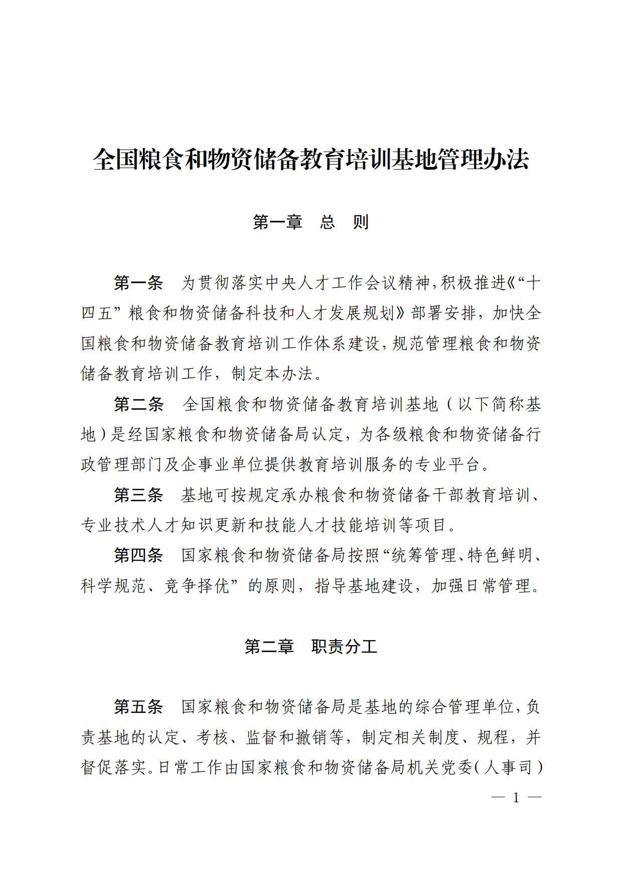 第一条 为贯彻落实中央人才工作会议精神,积极推进《“十 四五”粮食和物资储备科技和人才发展规划》部署安排,加快全国粮食和物资储备教育培训工作体系建设,规范管理粮食和物资储备教育培训工作,制定本办法。