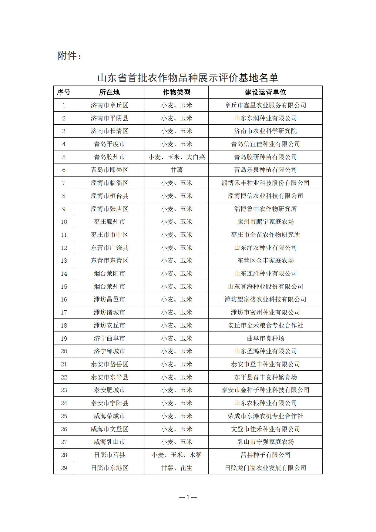 附件:山东省首批农作物品种展示评价基地名单