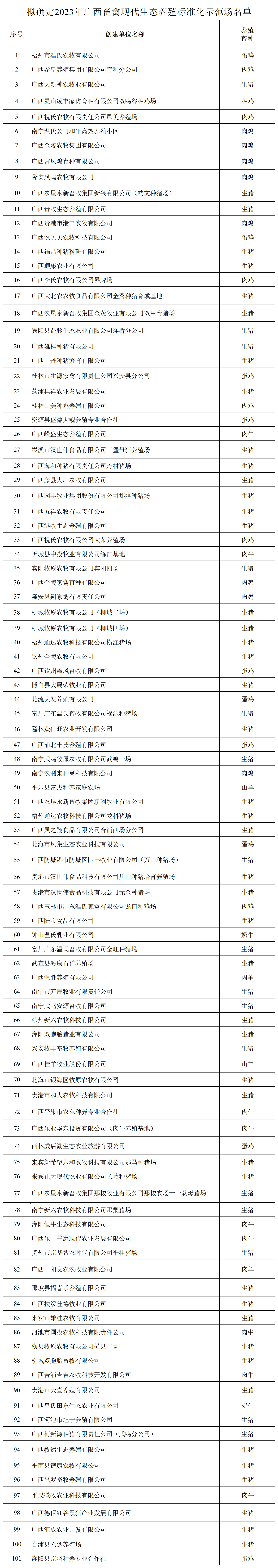 根据《自治区农业农村厅办公室关于印发2023年广西畜禽现代生态养殖标准化示范创建工作方案的通知》(桂农厅办发〔2023〕44号)要求,我厅组织开展了2023年广西畜禽现代生态养殖标准化示范创建活动。根据创建情况,现拟确定梧州市温氏农牧有限公司等101家(具体名单见附件)企业(场)为2023年广西畜禽现代生态养殖标准化示范场。
