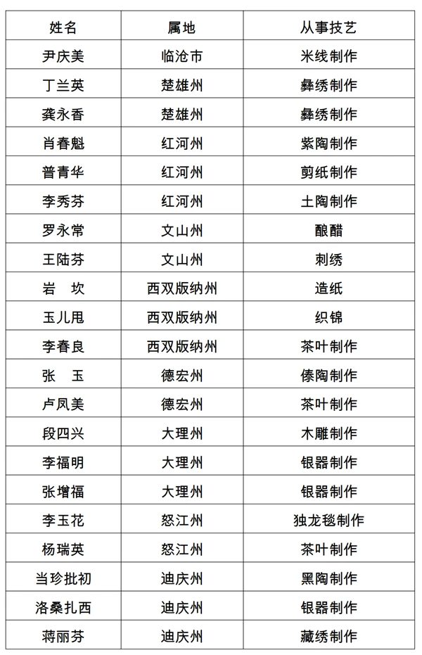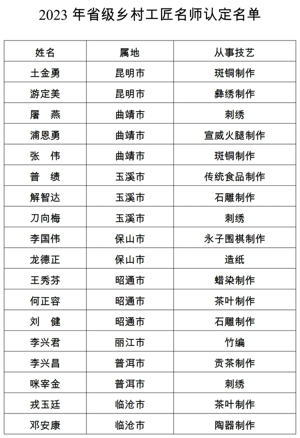 根据《省乡村振兴局等8部门关于印发〈乡村工匠“双百双千”培育工程实施方案〉的通知》(云乡振发〔2023〕52号),在各州(市)、县(市、区)推荐的基础上,经资格复核、行业联评、社会公示,省乡村振兴局等8部门联合认定土金勇等39人为2023年省级乡村工匠名师,现予以公布。