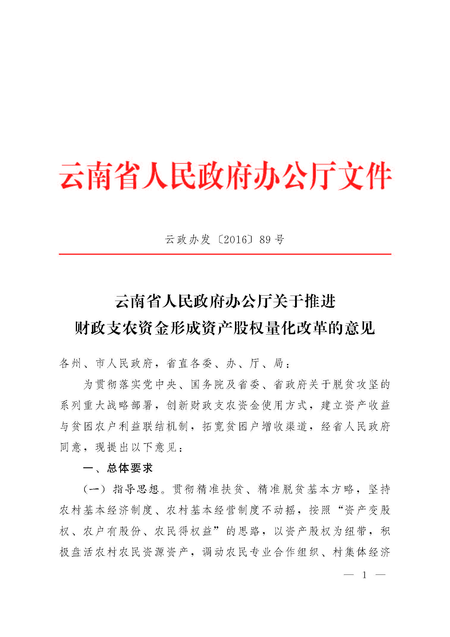 云南省人民政府办公厅关于推进财政支农资金形成资产股权量化改革的意见