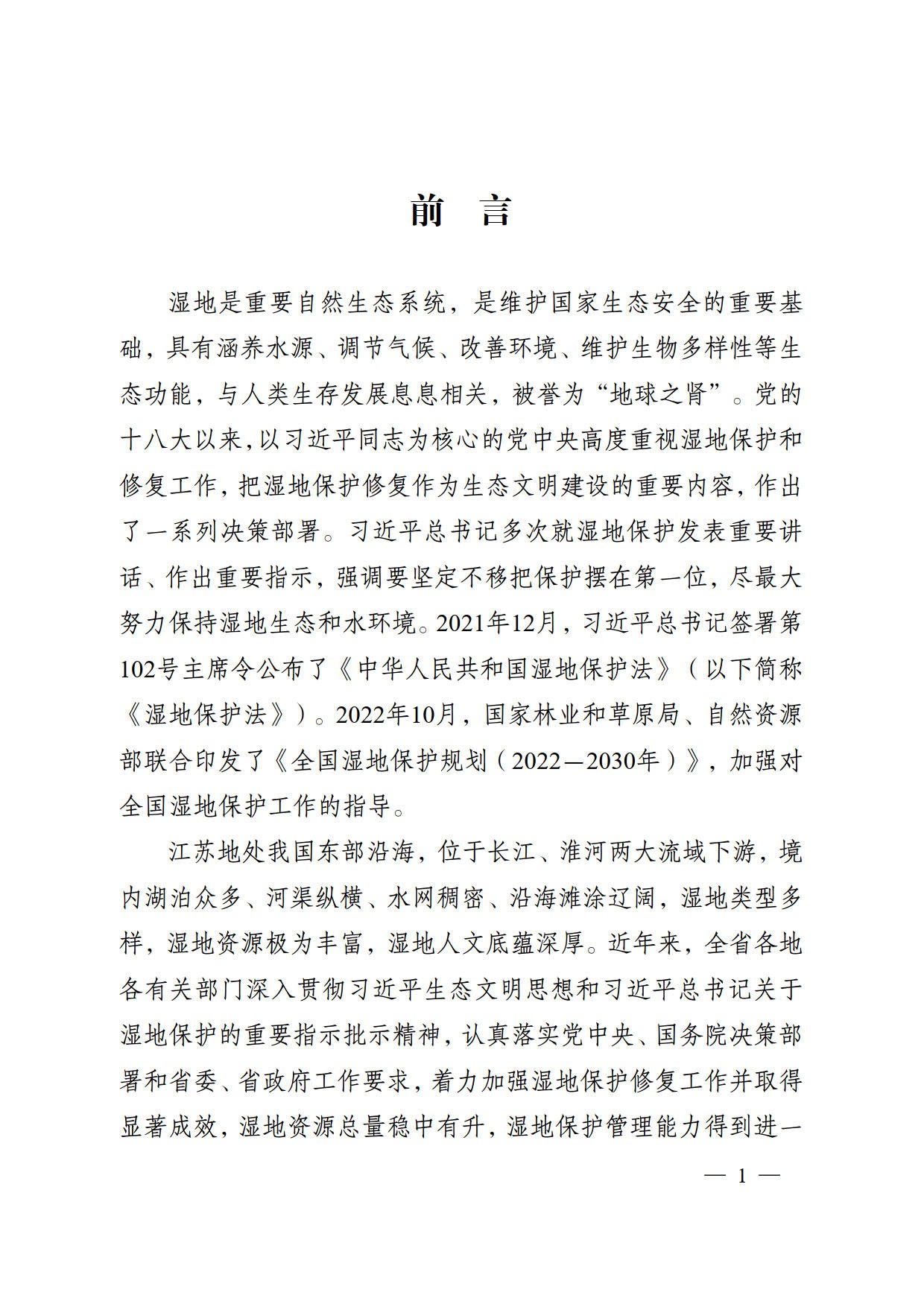 湿地是重要自然生态系统,是维护国家生态安全的重要基础,具有涵养水源、调节气候、改善环境、维护生物多样性等生态功能,与人类生存发展息息相关,被誉为“地球之肾”。党的 十八大以来,以习近平同志为核心的党中央高度重视湿地保护和修复工作,把湿地保护修复作为生态文明建设的重要内容,作出了一系列决策部署。习近平总书记多次就湿地保护发表重要讲话、作出重要指示,强调要坚定不移把保护摆在第一位,尽最大努力保持湿地生态和水环境。2021年12月,习近平总书记签署第102号主席令公布了《中华人民共和国湿地保护法》(以下简称《湿地保护法》)。2022年10月,国家林业和草原局、自然资源部联合印发了《全国湿地保护规划(2022-2030年)》,加强对全国湿地保护工作的指导。