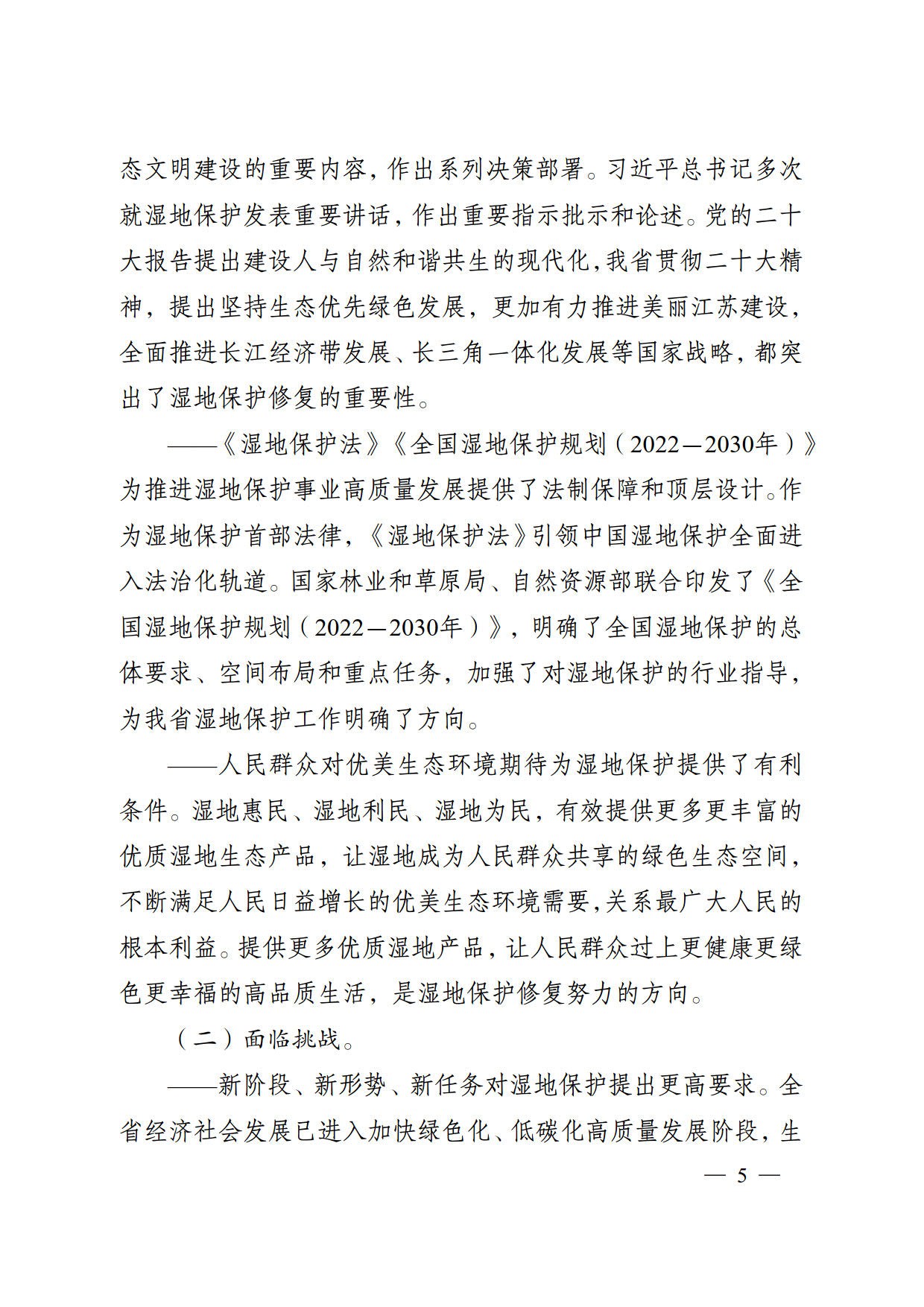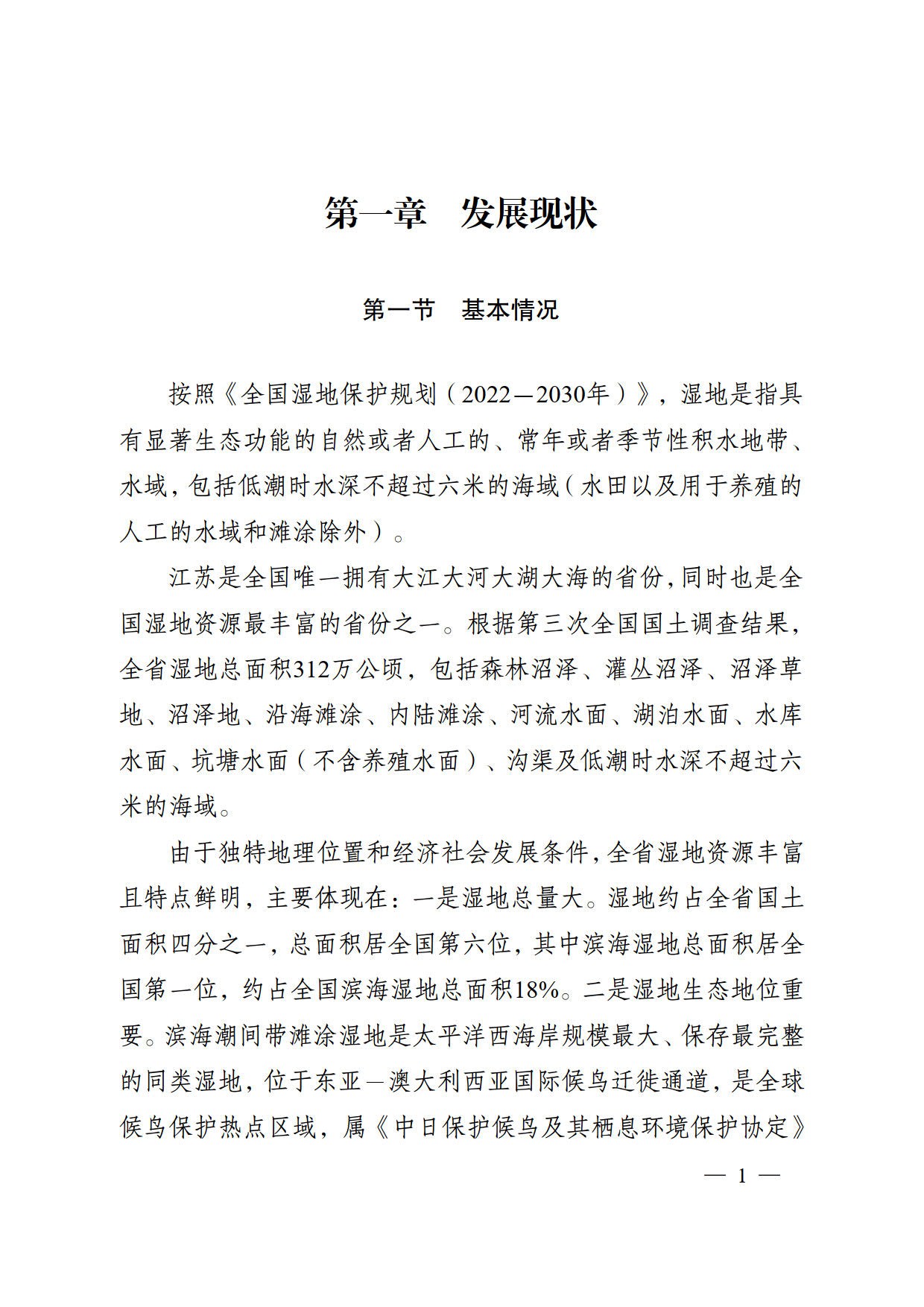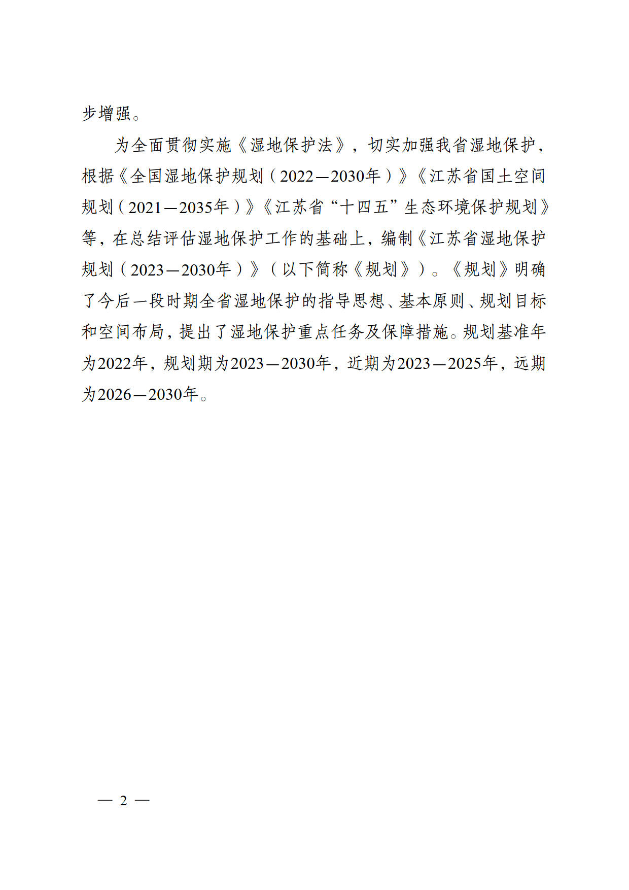 为全面贯彻实施《湿地保护法》,切实加强我省湿地保护, 根据《全国湿地保护规划(2022-2030年)》《江苏省国土空间 规划(2021-2035年)》《江苏省“十四五”生态环境保护规划》 等,在总结评估湿地保护工作的基础上,编制《江苏省湿地保护规划(2023-2030年)》(以下简称《规划》)。《规划》明确了今后一段时期全省湿地保护的指导思想、基本原则、规划目标和空间布局,提出了湿地保护重点任务及保障措施。规划基准年为2022年,规划期为2023-2030年,近期为2023-2025年,远期为2026-2030年。