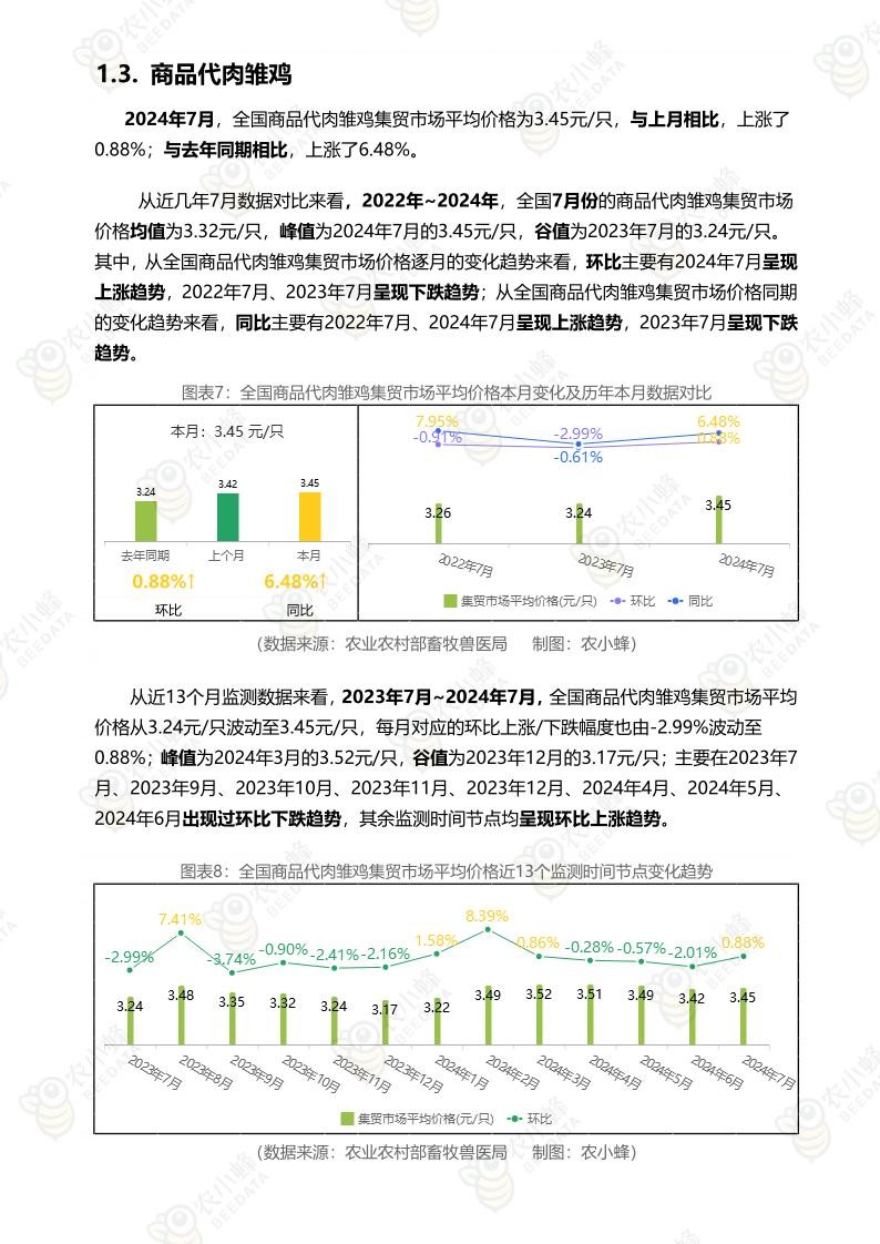 2024年7月,全国商品代肉雏鸡集贸市场平均价格为3.45元/只,与上月相比,上涨了 0.88%;与去年同期相比,上涨了6.48%。