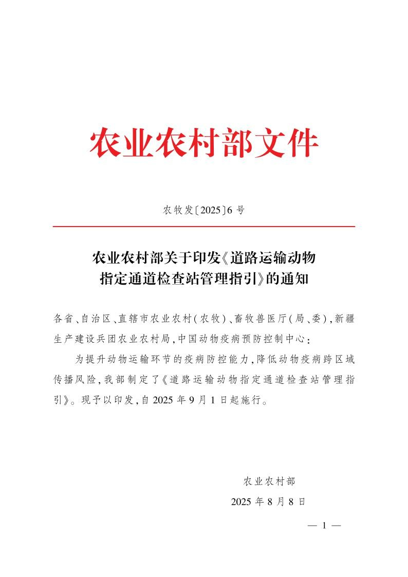 为提升动物运输环节的疫病防控能力,降低动物疫病跨区域传播风险,我部制定了《道路运输动物指定通道检查站管理指引》。现予以印发,自 2025年 9月 1 日起施行。