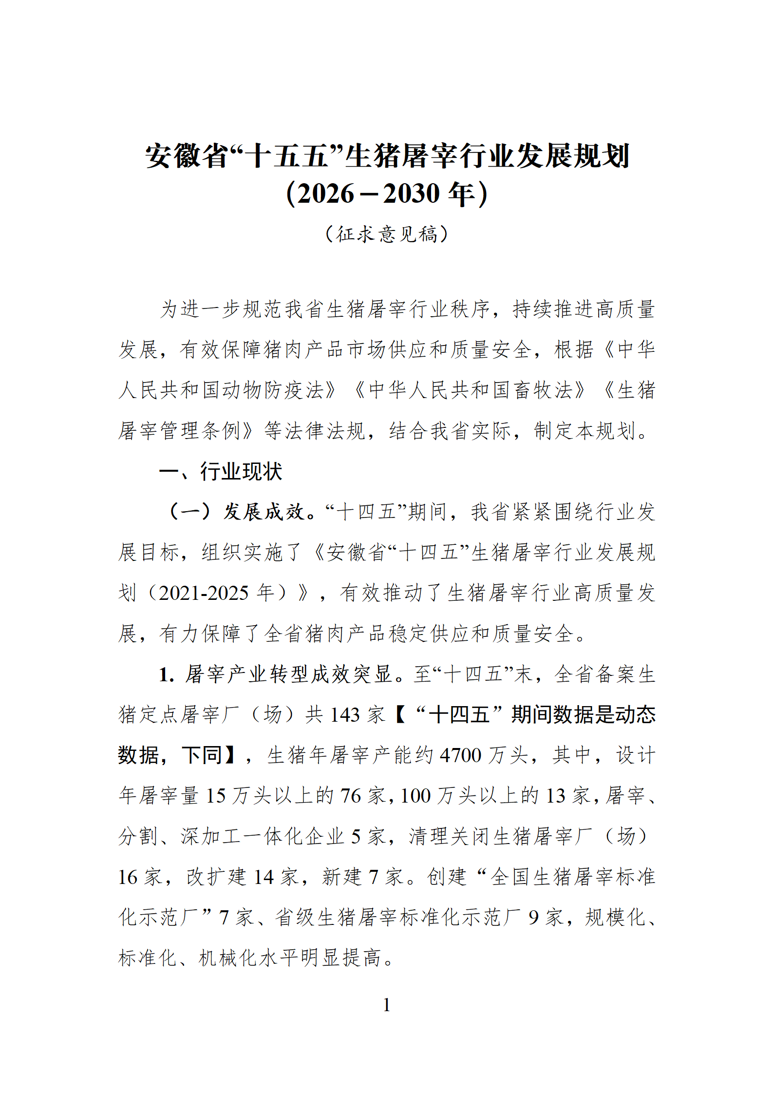 附件 :安徽省“十五五”生猪屠宰行业发展规划(2026-2030年)(征求意见稿)》