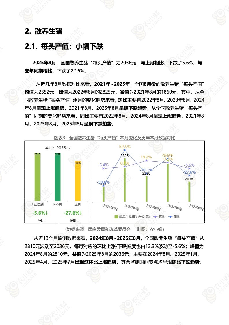 2025年8月,全国散养生猪“每头产值”为2036元,与上月相比,下跌了5.6%;与去年同期相比,下跌了27.6%。