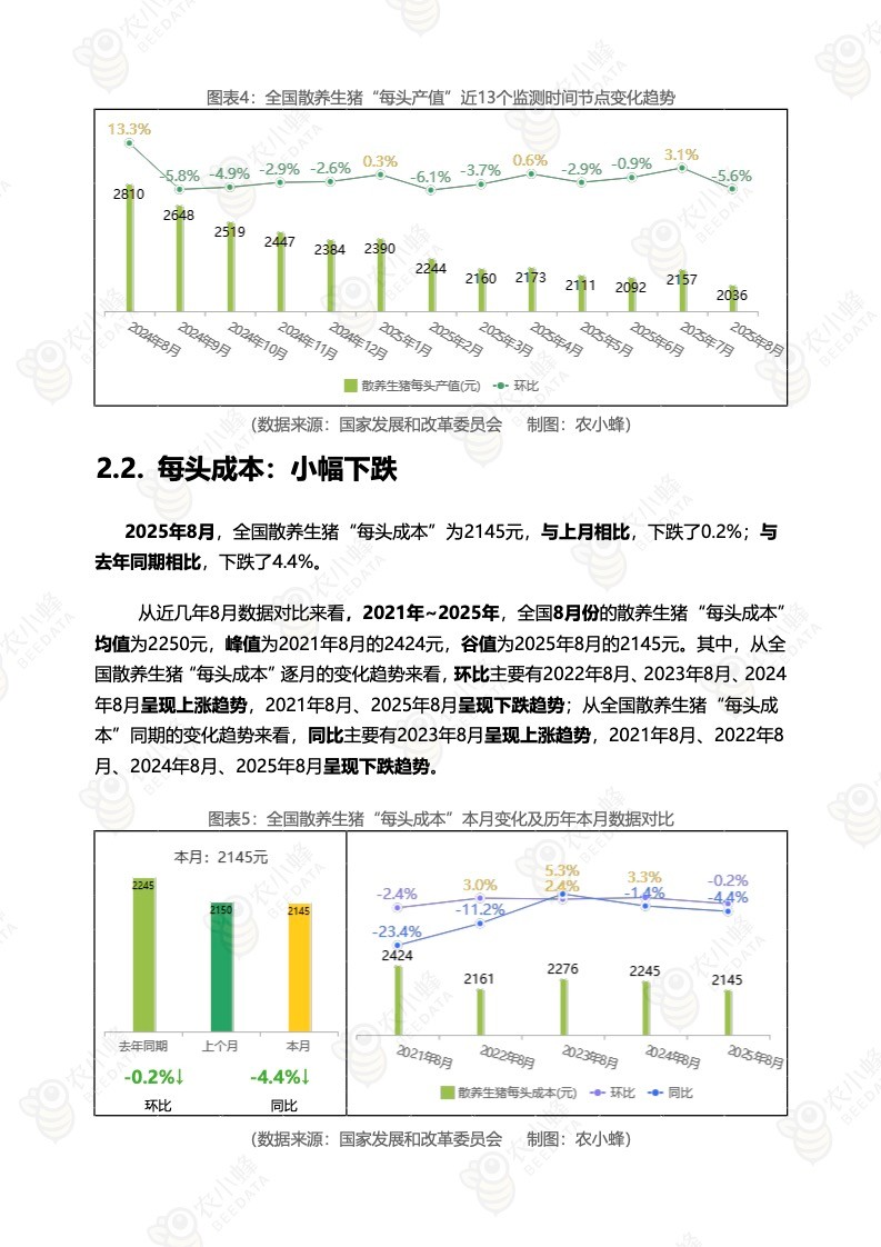 2025年8月,全国散养生猪“每头成本”为2145元,与上月相比,下跌了0.2%;与去年同期相比,下跌了4.4%。