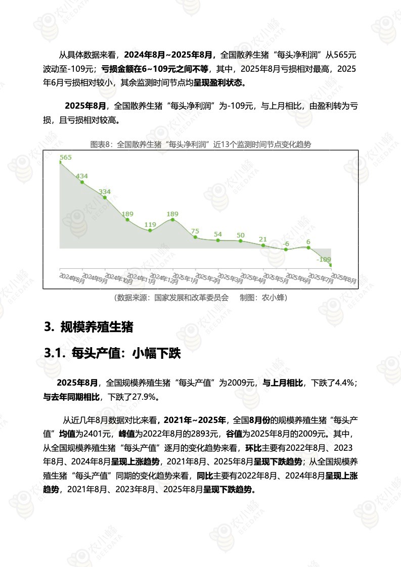 2025年8月,全国散养生猪“每头净利润”为-109元,与上月相比,由盈利转为亏损,且亏损相对较高。