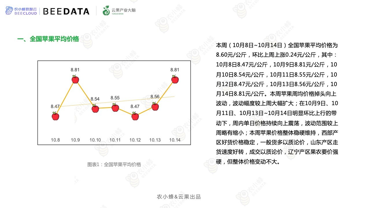 本周(10月8日~10月14日)全国苹果平均价格为8.60元/公斤,环比上周上涨0.24元/公斤,本周苹果周均价格掉头向上波动,波动幅度较上周大幅扩大;