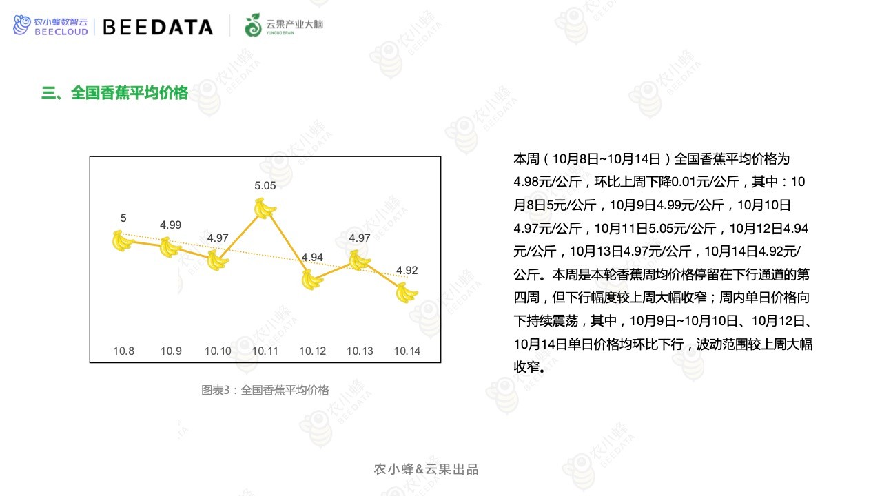 本周(10月8日~10月14日)全国香蕉平均价格为4.98元/公斤,环比上周下降0.01元/公斤,本周是本轮香蕉周均价格停留在下行通道的第四周,但下行幅度较上周大幅收窄;