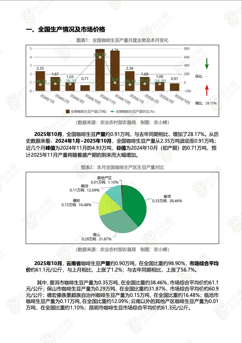 2025年10月,云南省咖啡生豆产量约0.90万吨,在全国比重约98.90%,市场综合平均价约61.1元/公斤,与上月相比,上涨了1.2%;与去年同期相比,上涨了56.7%。