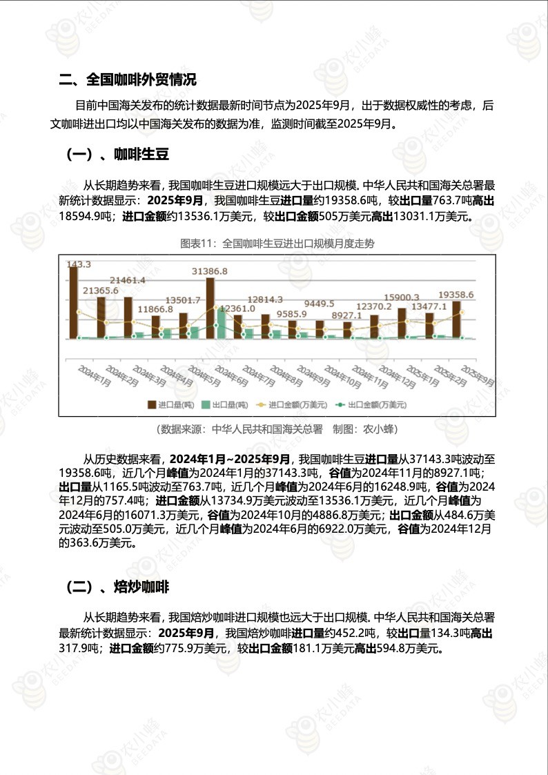2025年9月,我国咖啡生豆进口量约19358.6吨,较出口量763.7吨高出18594.9吨;进口金额约13536.1万美元,较出口金额505万美元高出13031.1万美元。