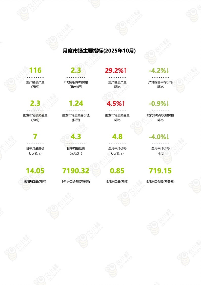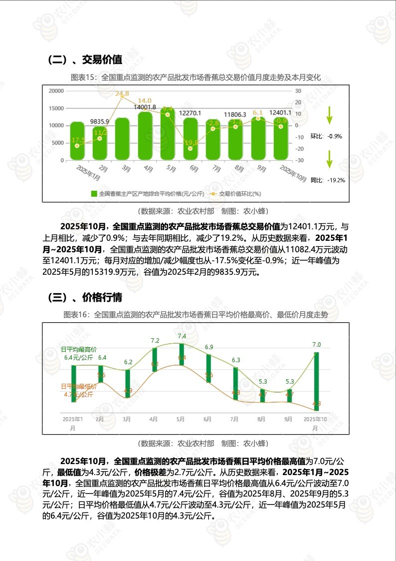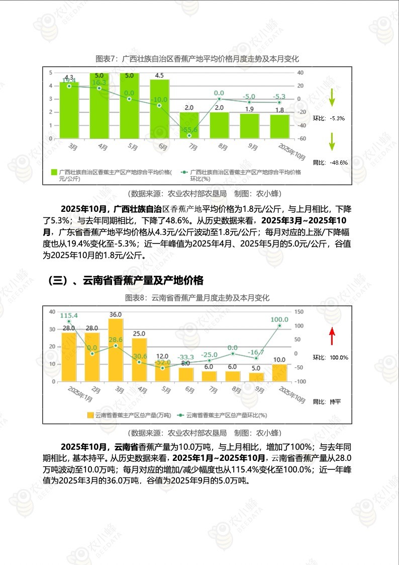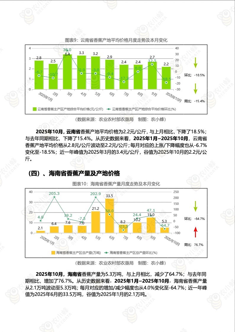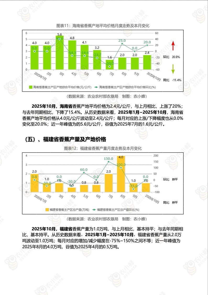 2025年10月,全国香蕉主产区产地综合平均价格为2.3元/公斤,与上月相比,下降了4.2%;与去年同期相比,下降了20.4%。从历史数据来看,2025年1月~2025年10月,全国香蕉主产区产地综合平均价格从2.8元/公斤波动至2.3元/公斤;每月对应的上涨/下降幅度也从-4.6%变化至-4.2%;近一年峰值为2025年5月的3.6元/公斤,谷值为2025年10月的2.3元/公斤。