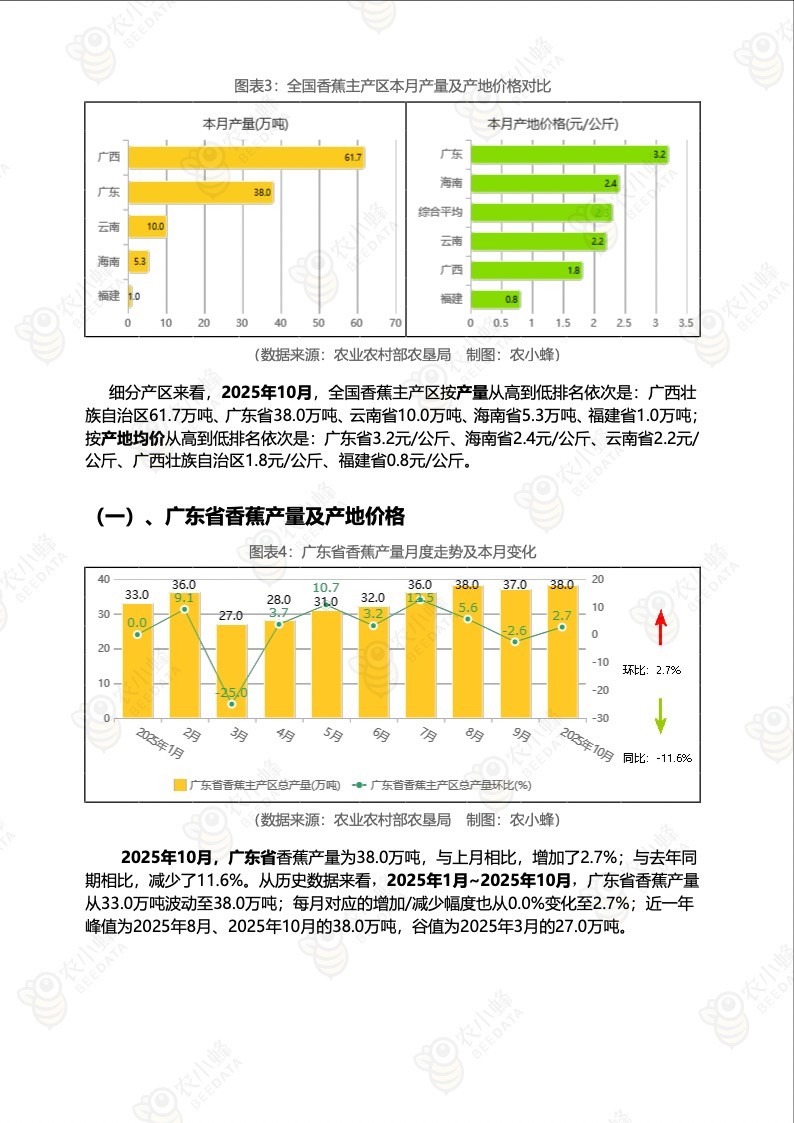 细分产区来看,2025年10月,全国香蕉主产区按产量从高到低排名依次是:广西壮族自治区61.7万吨、广东省38.0万吨、云南省10.0万吨、海南省5.3万吨、福建省1.0万吨;按产地均价从高到低排名依次是:广东省3.2元/公斤、海南省2.4元/公斤、云南省2.2元/公斤、广西壮族自治区1.8元/公斤、福建省0.8元/公斤。