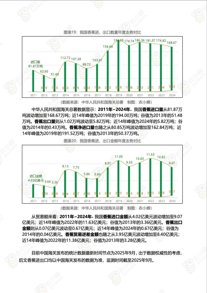 2025年9月,我国香蕉进口量为14.05万吨,进口金额为7190.32万美元。从历史数据来看,2024年10月~2025年9月,全国香蕉进口量从13.58万吨波动至14.05万吨,近一年峰值为2025年4月的23.15万吨,谷值为2025年8月的12.86万吨;进口金额从7886.46万美元波动至7190.32万美元,近一年峰值为2025年4月的12481.49万美元,谷值为2025年8月的6875.83万美元。2025年1~9月,我国香蕉累计进口152.72万吨,金额累计约84242.87万美元。
