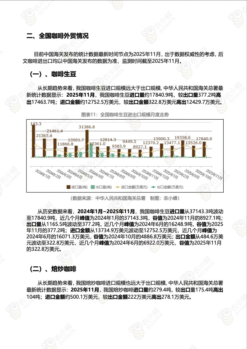 2025年11月,我国咖啡生豆进口量约17840.9吨,较出口量377.2吨高出17463.7吨;进口金额约12752.5万美元,较出口金额322.8万美元高出12429.7万美元。