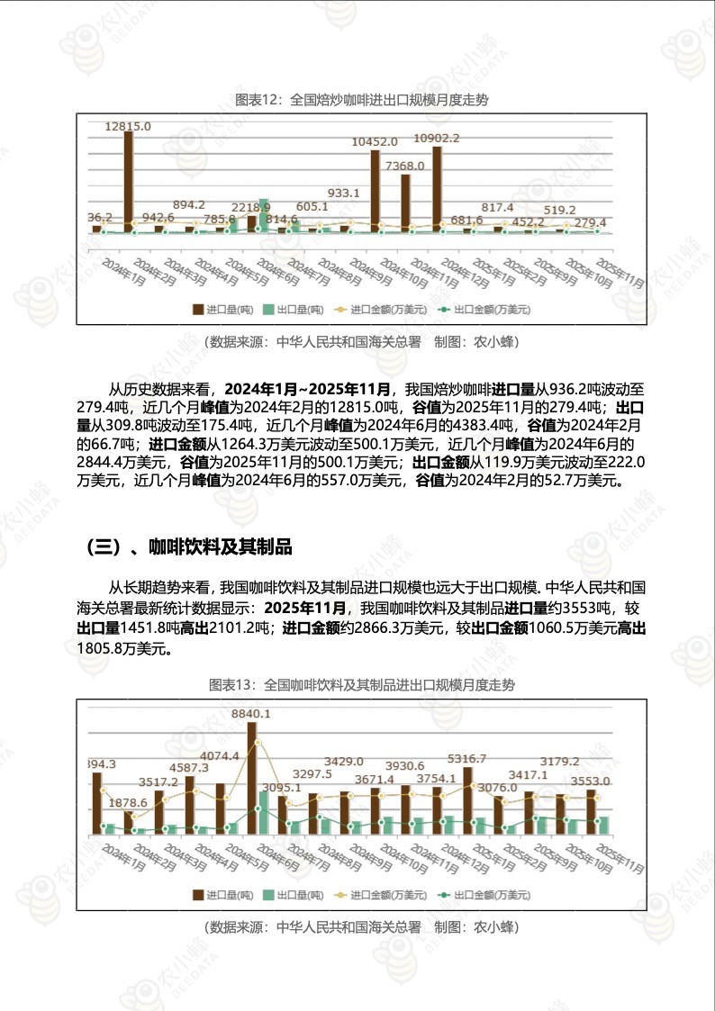 2025年11月,我国咖啡饮料及其制品进口量约3553吨,较出口量1451.8吨高出2101.2吨;进口金额约2866.3万美元,较出口金额1060.5万美元高出1805.8万美元。