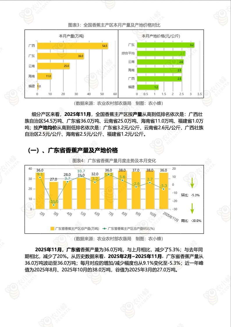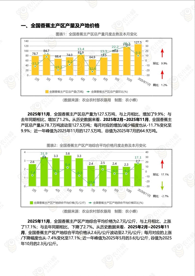 2025年11月,全国香蕉主产区总产量为127.5万吨,与上月相比,增加了9.9%;与去年同期相比,增加了1.2%。从历史数据来看,2025年2月~2025年11月,全国香蕉主产区总产量从78.7万吨波动至127.5万吨;每月对应的增加/减少幅度也从-11.7%变化至9.9%;近一年峰值为2025年11月的127.5万吨,谷值为2025年7月的64.9万吨。