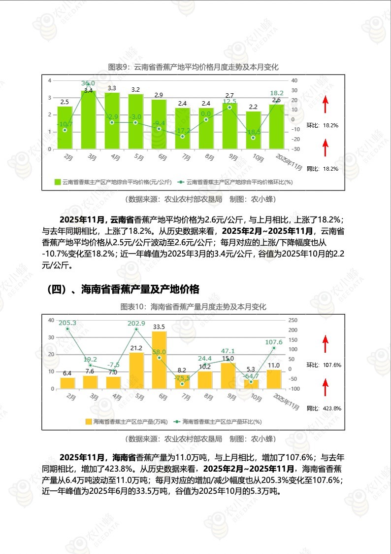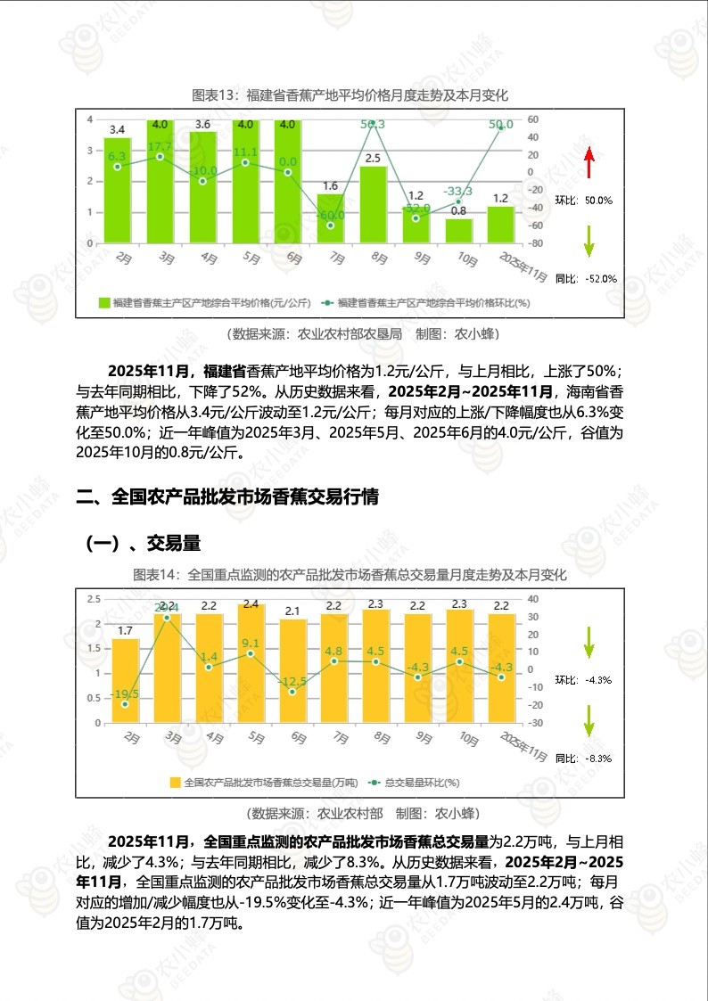 2025年11月,全国香蕉主产区产地综合平均价格为2.7元/公斤,与上月相比,上涨了17.1%;与去年同期相比,下降了2.7%。从历史数据来看,2025年2月~2025年11月,全国香蕉主产区产地综合平均价格从2.6元/公斤波动至2.7元/公斤;每月对应的上涨/下降幅度也从-7.4%变化至17.1%;近一年峰值为2025年5月的3.6元/公斤,谷值为2025年10月的2.3元/公斤。