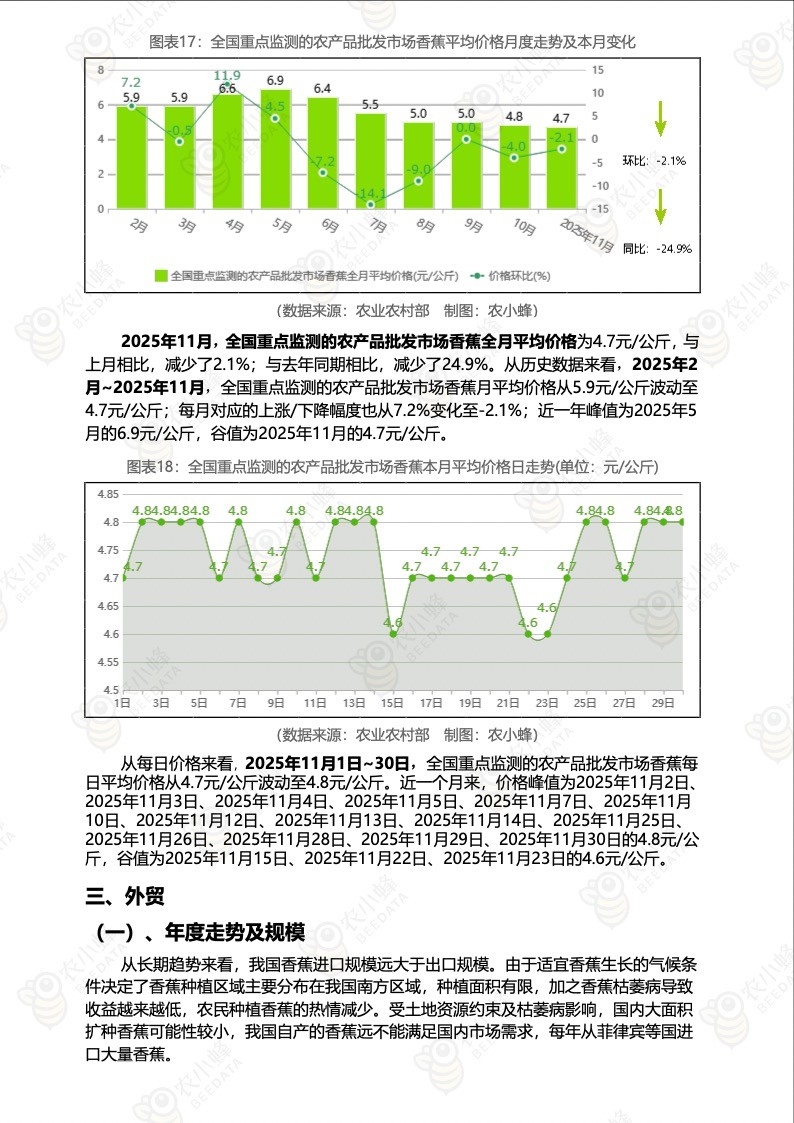 2025年11月,全国重点监测的农产品批发市场香蕉全月平均价格为4.7元/公斤,与上月相比,减少了2.1%;与去年同期相比,减少了24.9%。从历史数据来看,2025年2月~2025年11月,全国重点监测的农产品批发市场香蕉月平均价格从5.9元/公斤波动至4.7元/公斤;每月对应的上涨/下降幅度也从7.2%变化至-2.1%;近一年峰值为2025年5月的6.9元/公斤,谷值为2025年11月的4.7元/公斤。
