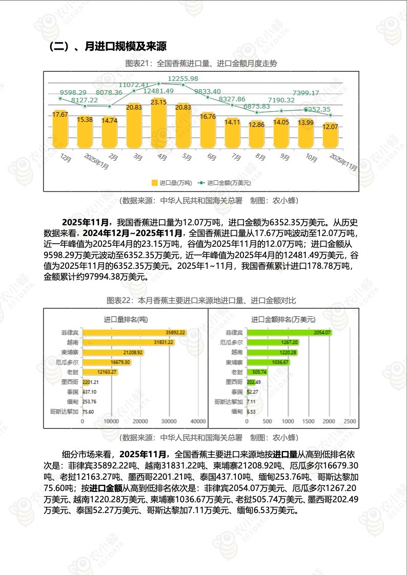 2025年11月,我国香蕉进口量为12.07万吨,进口金额为6352.35万美元。从历史数据来看,2024年12月~2025年11月,全国香蕉进口量从17.67万吨波动至12.07万吨,近一年峰值为2025年4月的23.15万吨,谷值为2025年11月的12.07万吨;进口金额从9598.29万美元波动至6352.35万美元,近一年峰值为2025年4月的12481.49万美元,谷值为2025年11月的6352.35万美元。2025年1~11月,我国香蕉累计进口178.78万吨,金额累计约97994.38万美元。