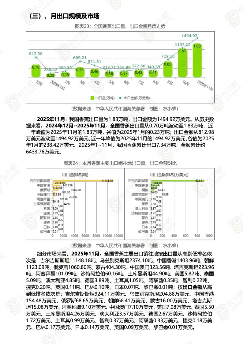 2025年11月,我国香蕉出口量为1.83万吨,出口金额为1494.92万美元。从历史数据来看,2024年12月~2025年11月,全国香蕉出口量从0.70万吨波动至1.83万吨,近一年峰值为2025年11月的1.83万吨,谷值为2025年1月的0.23万吨;出口金额从812.98万美元波动至1494.92万美元,近一年峰值为2025年11月的1494.92万美元,谷值为2025年1月的238.42万美元。2025年1~11月,我国香蕉累计出口7.34万吨,金额累计约6433.76万美元。
