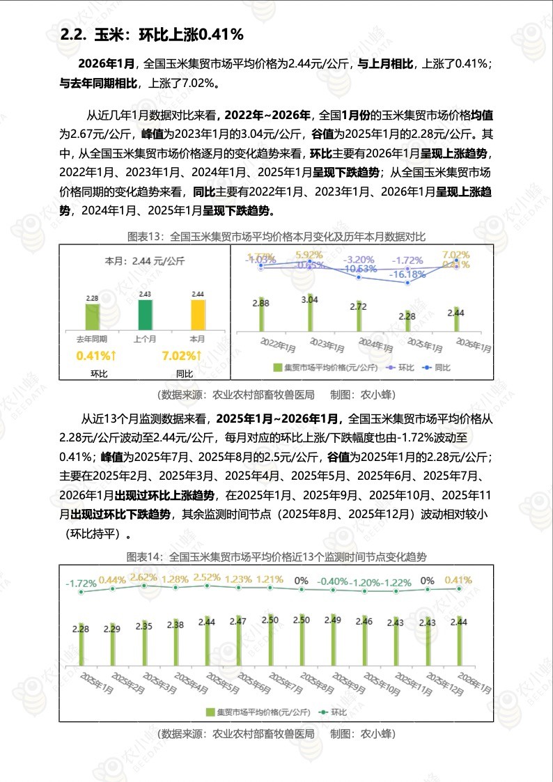 2026年1月,全国玉米集贸市场平均价格为2.44元/公斤,与上月相比,上涨了0.41%;与去年同期相比,上涨了7.02%。