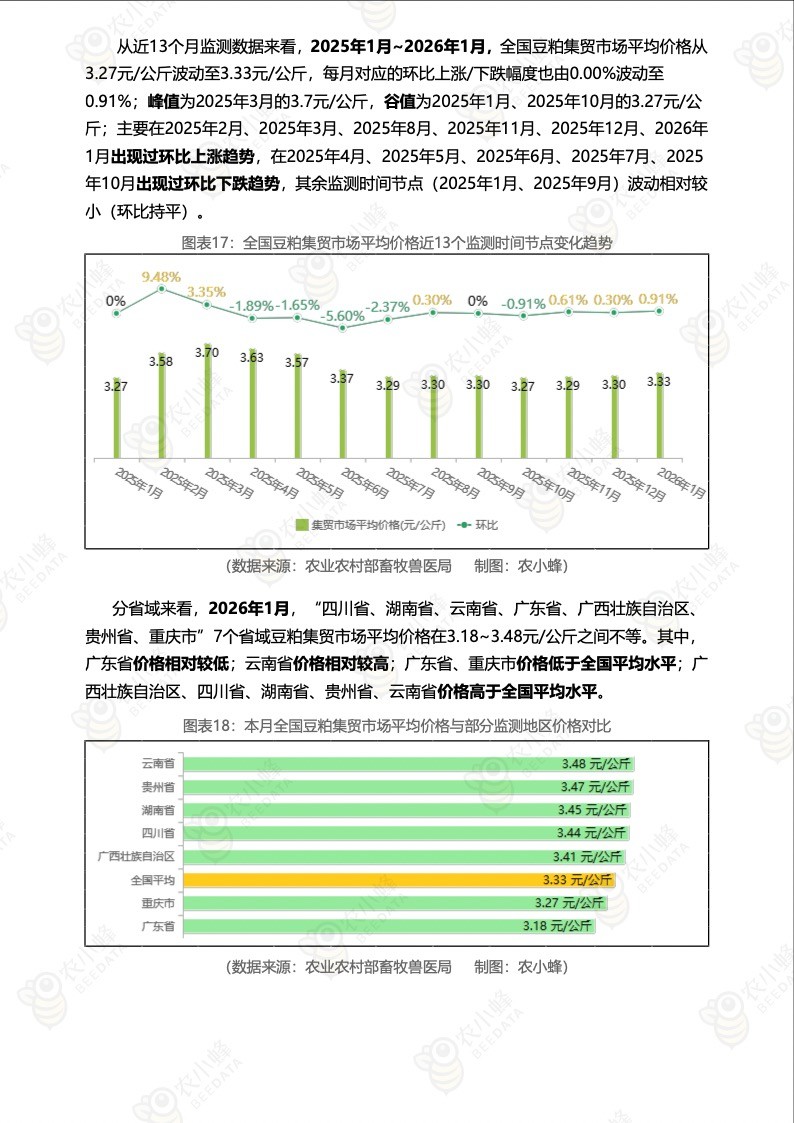 2026年1月,全国豆粕集贸市场平均价格为3.33元/公斤,与上月相比,上涨了0.91%;与去年同期相比,上涨了1.83%。
