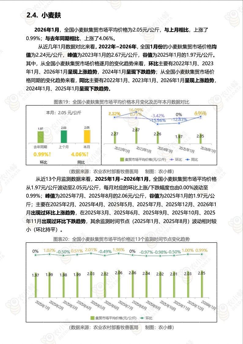 2026年1月,全国小麦麸集贸市场平均价格为2.05元/公斤,与上月相比,上涨了0.99%;与去年同期相比,上涨了4.06%。