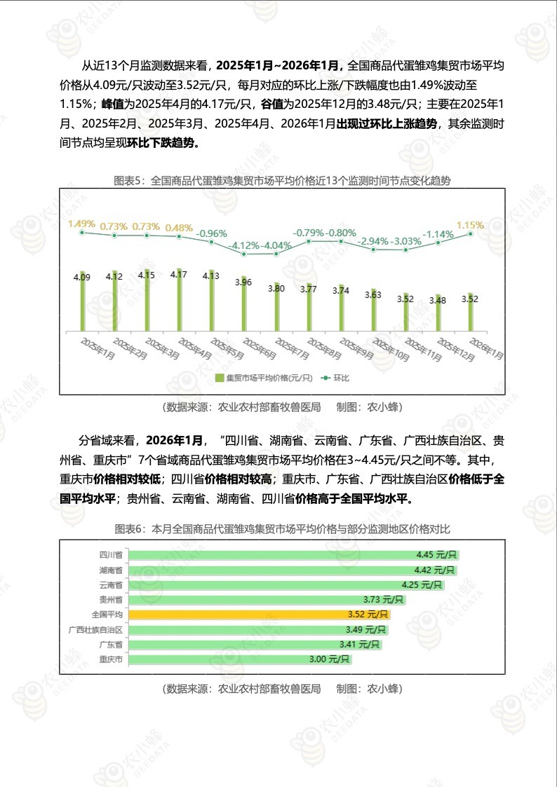 2026年1月,全国商品代蛋雏鸡集贸市场平均价格为3.52元/只,与上月相比,上涨了1.15%;与去年同期相比,下跌了13.94%。