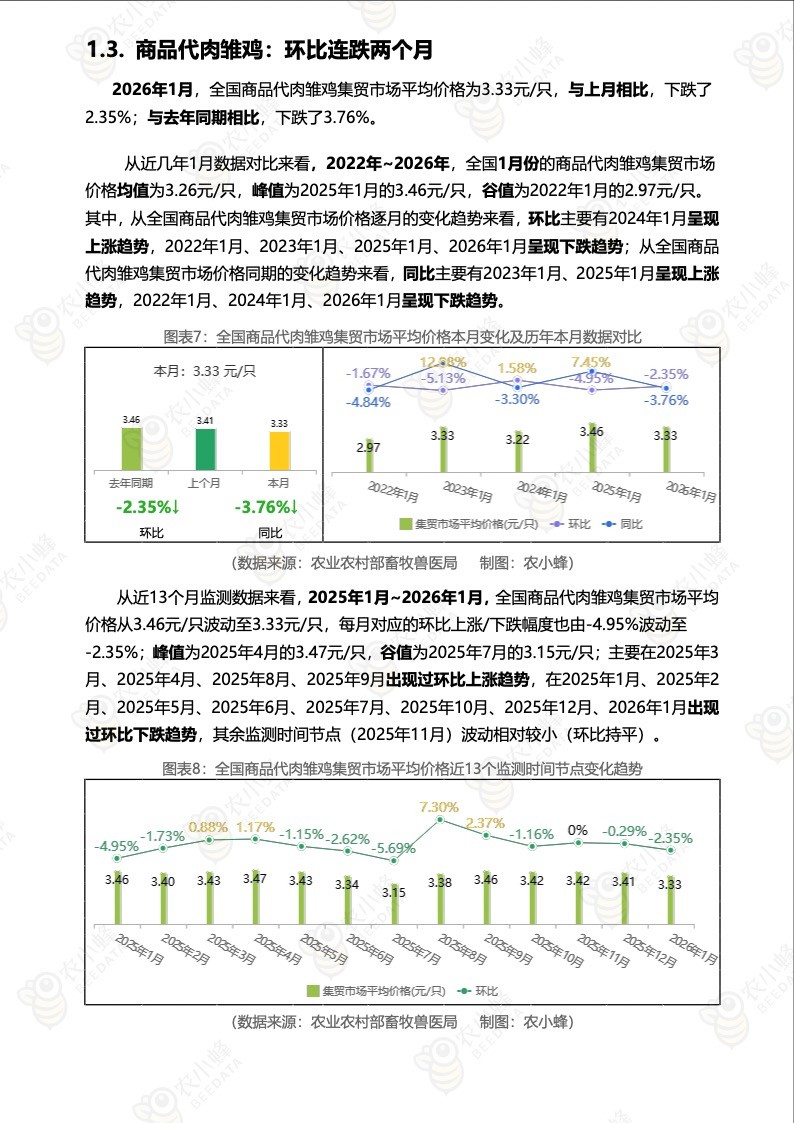 2026年1月,全国商品代肉雏鸡集贸市场平均价格为3.33元/只,与上月相比,下跌了2.35%;与去年同期相比,下跌了3.76%。