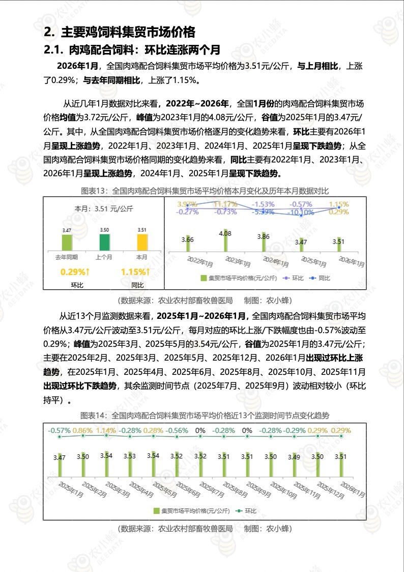 2026年1月,全国肉鸡配合饲料集贸市场平均价格为3.51元/公斤,与上月相比,上涨了0.29%;与去年同期相比,上涨了1.15%。