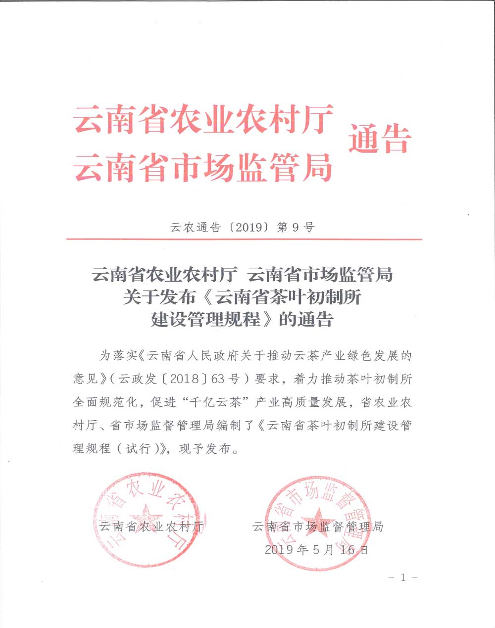云南省农业农村厅 云南省市场监管局关于发布《云南省茶叶初制所建设管理规程》的通告