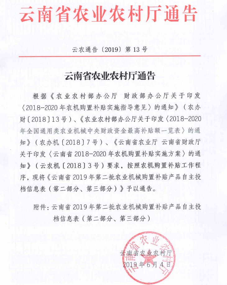 云南省农业农村厅通告(第二批购机补贴产品自主投档信息表)
