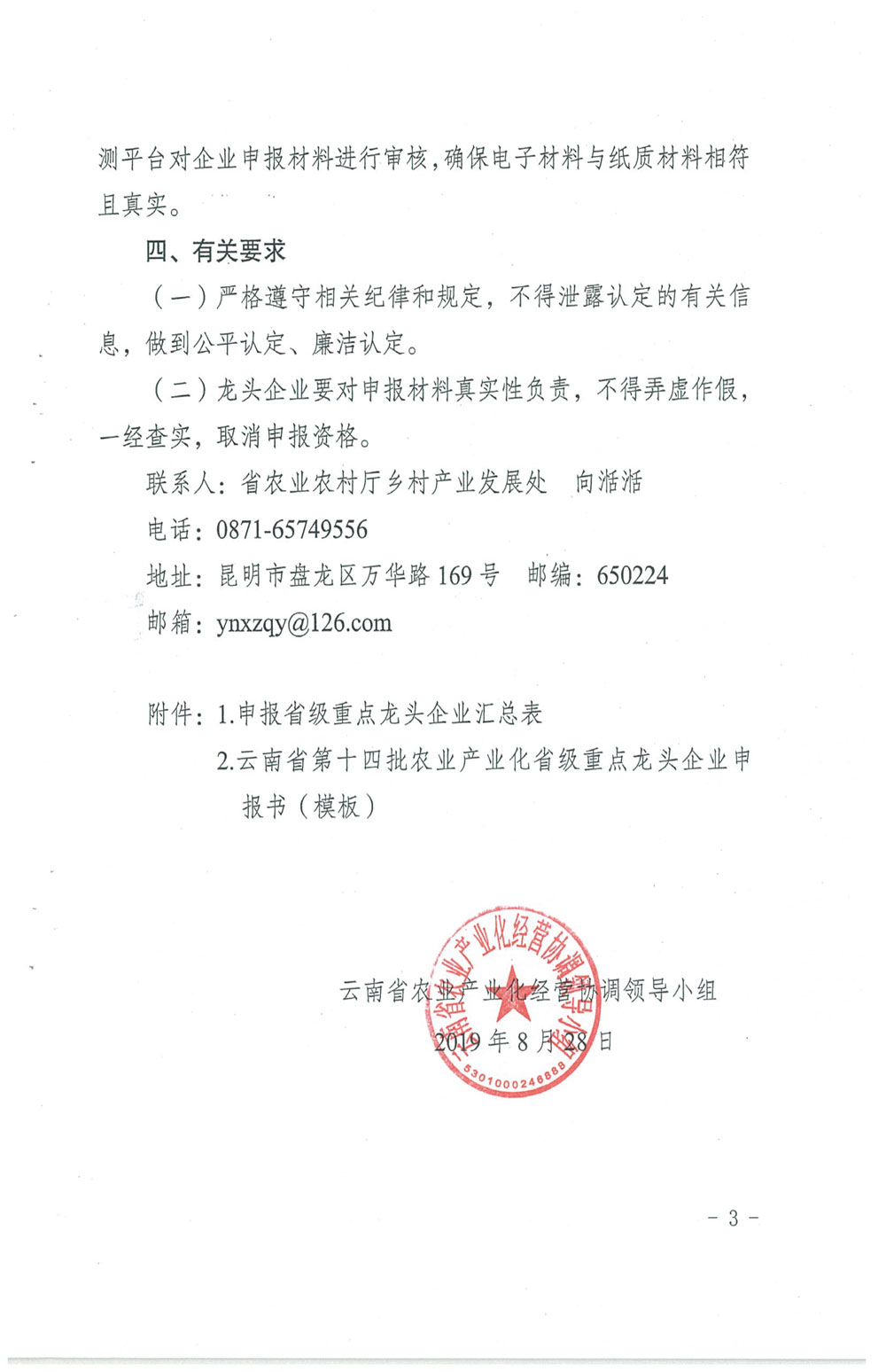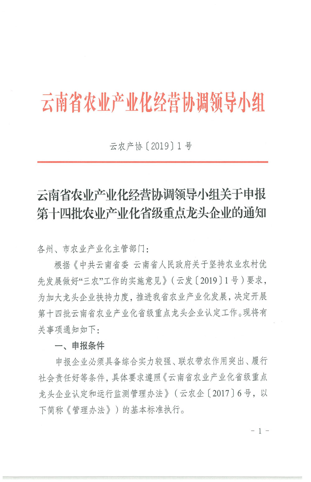 云南省农业产业化经营协调领导小组关于申报第十四批农业产业化省级重点龙头企业的通