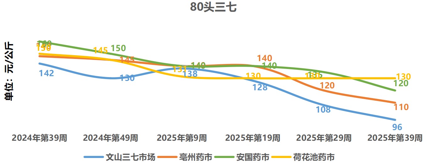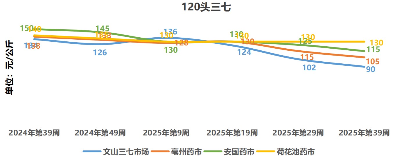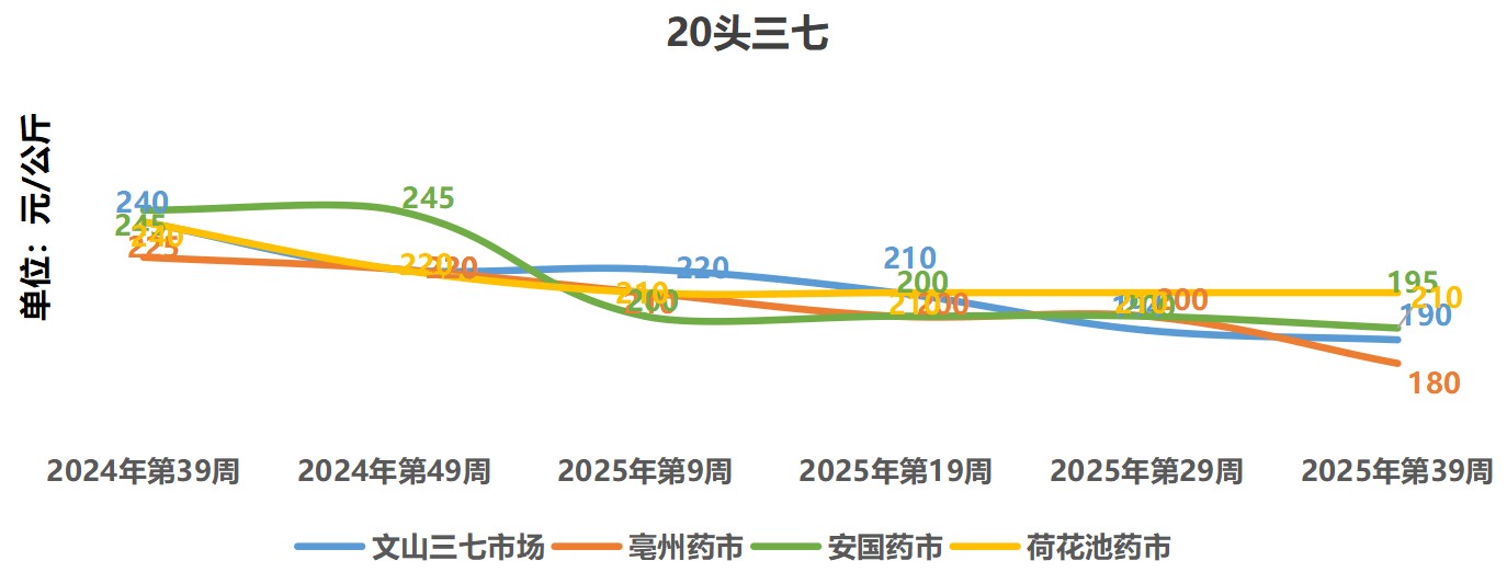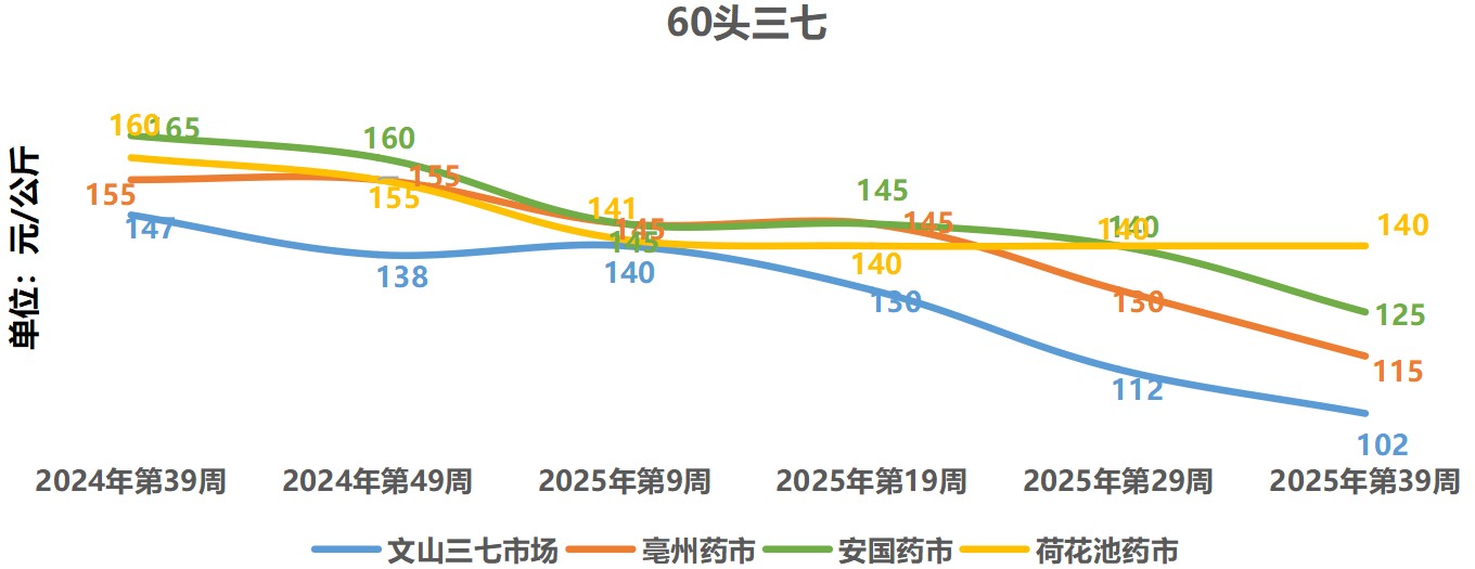 近一年各药市不同规格三七价格走势(2024年39周-2025年39周)